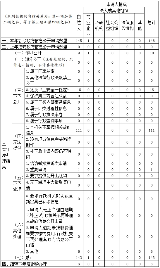 (二)依申请公开情况。2023年,我办共收到政府信息公开申请146件,其中自然人申请145件,法人申请1件,皆按时完成答复,3件为跨年度答复,无行政复议和行政诉讼,未收取任何费用。