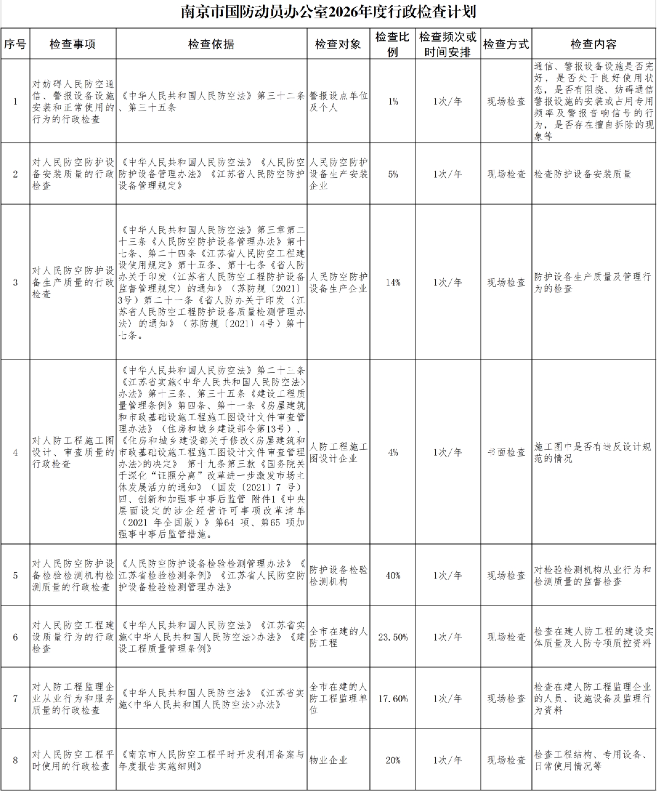 南京市国防动员办公室2026年度行政检查计划