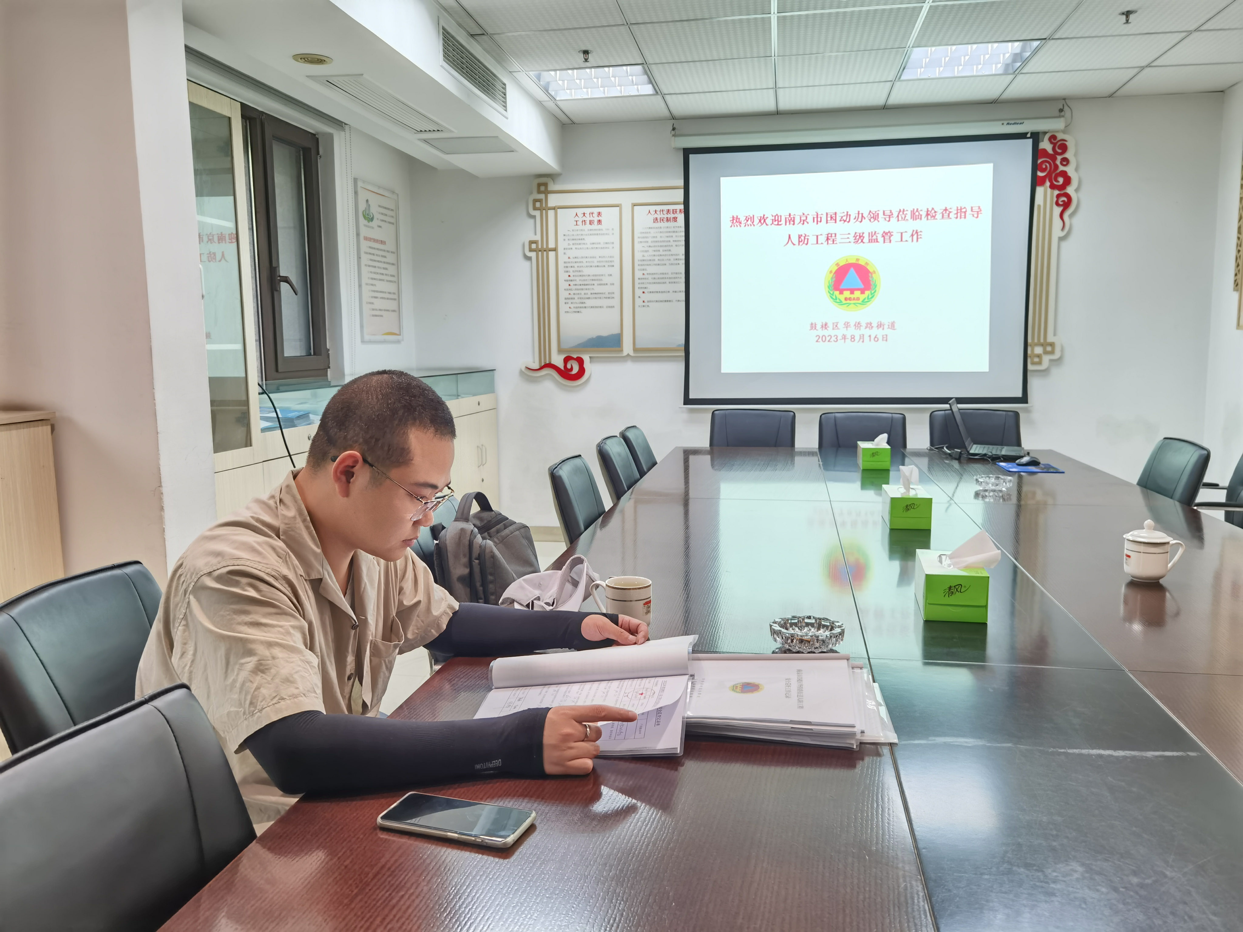 近期,南京市国动办组织开展基层人防专项经费使用绩效评价检查工作。8月16日上午,评价检查组到鼓楼区华侨路街道进行检查,听取街道人防工程安全巡查工作情况汇报及专项经费使用情况说明,走进街道财务室查看原始账目,对街道人防专项经费使用情况给予肯定,街道办事处主任郝雷陪同检查。