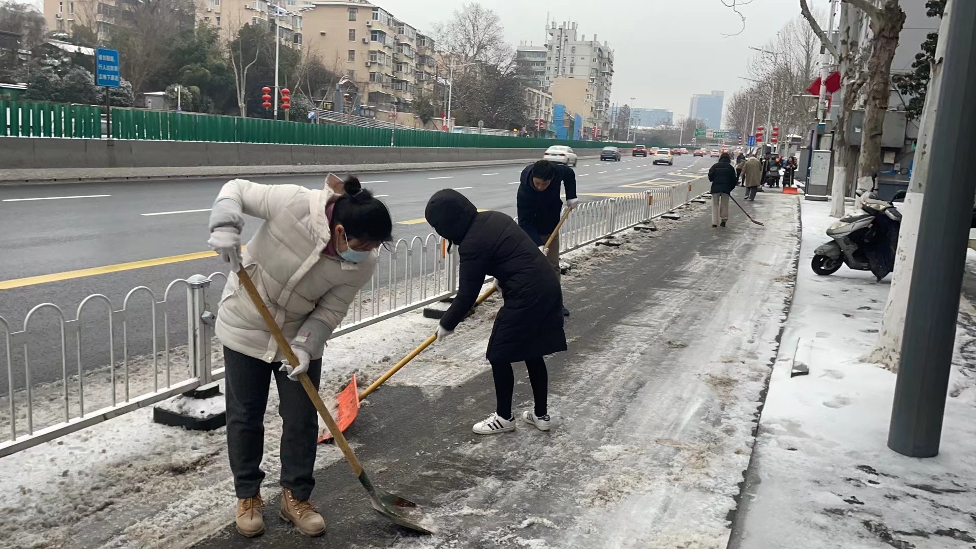近日,南京市经历强降雪过程,道路被厚厚的积雪所覆盖,车辆行驶缓慢,行人步履蹒跚,给人民群众出行带来极大的不便和安全隐患。2月23日一大早,鼓楼区宁海路街道古林社区人防志愿者在社区工作人员的带领下,带着铁锹、扫帚等工具赶赴分包路段进行清雪。在寒冷的环境中,大家团结协作,不畏严寒,有序的清理道路积雪。他们有的挥舞铁锨、铲冰除雪,有的手拿扫帚、清扫路面,经过二个小时的奋力打扫,街道上的积雪情况得到缓解,及时保证了辖区内道路的安全畅通,一条条清洁的大道给大家送去的不单单是方便、安全,更是传递了一份温暖、温情。