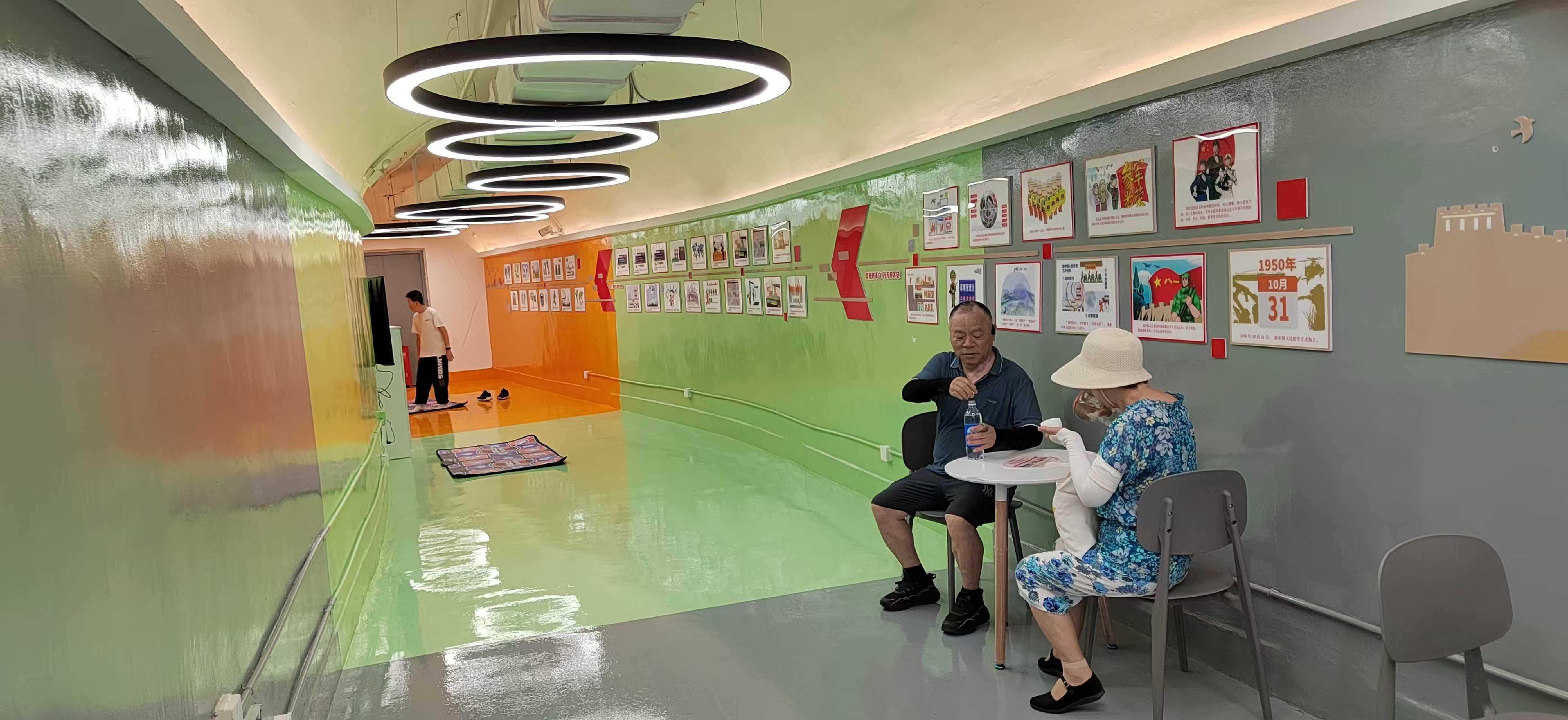 上午9:00,笔者来到鼓楼区狮子山人防工程纳凉点,看到该纳凉点进出的两个门已经打开,有三三两两的市民陆续走进去纳凉了。9:08,笔者在纳凉工程内看到运营方的工作人员正在对通风及供电设备进行常规检查。9:35,纳凉点休闲棋牌区有三四十位市民在纳凉聊天,在互动体验区,一位十来岁的小朋友玩着电动游戏;在阅读区,好几位家长带着孩子或在查阅书籍或在沉静阅读;在电影放映区,有市民在查询自己爱看的影片;在健身区几位穿着红马甲的志愿者在讨论着怎样给健身的市民提供帮助服务。9:45,一位完成早工的环卫工人坐在临门的休息区纳凉休息。9:50,笔者在纳凉点门口问一位刚走出纳凉点的张姓大妈,进去多长时间?感觉怎么样?张大妈回答,在里面纳凉二十分钟,有网络,还免费提供饮用水,配套也全,感觉蛮好。