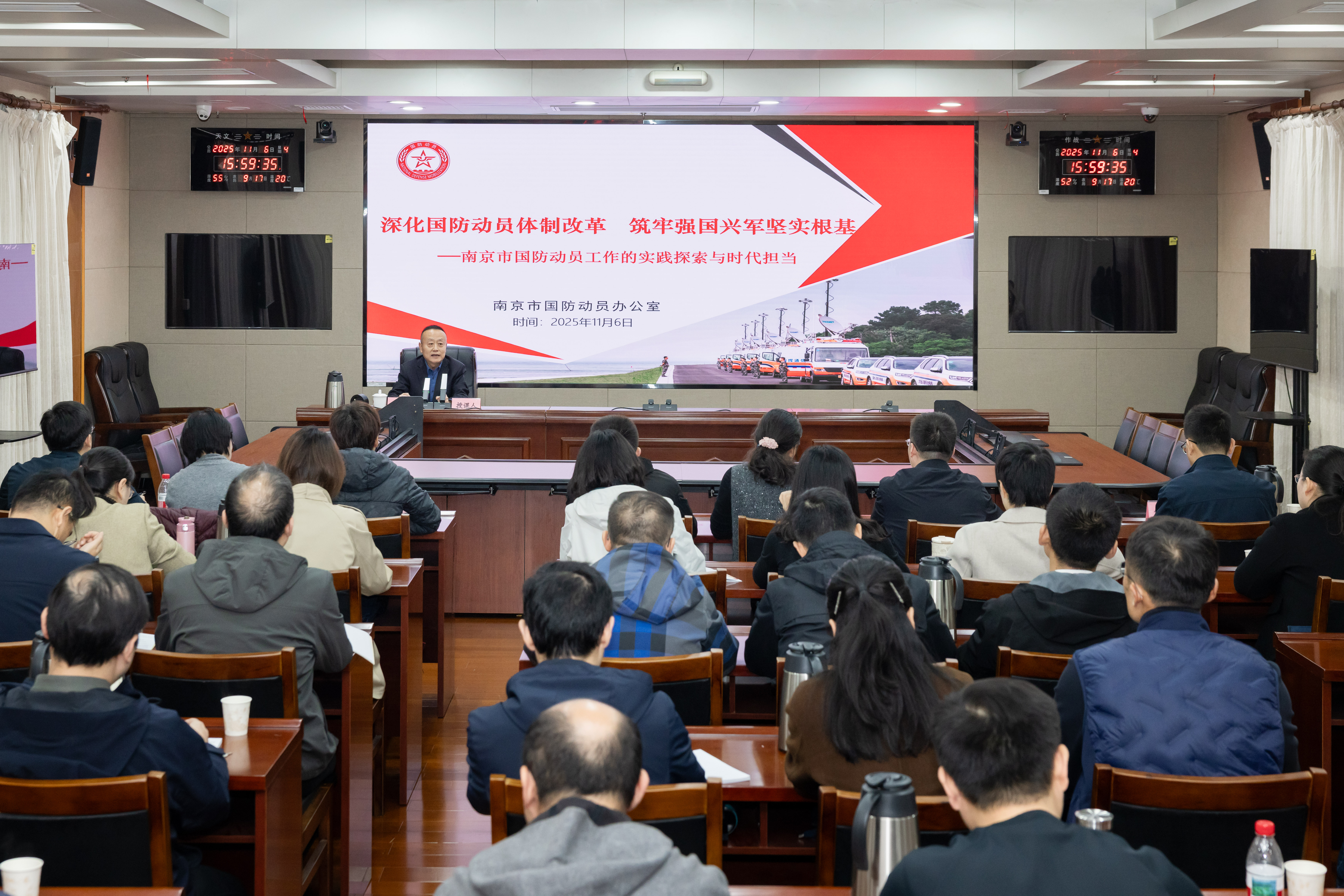 为深化对国防动员体制改革的认识,提升领导干部统筹发展与安全的能力,11月6日下午,市委党校第38期中青年干部培训一班全体学员走进南京市国防动员办公室,以实地参观、装备体验、理论授课相结合的方式,沉浸式感受国防动员(人民防空)建设成果,深刻领悟新时代国防动员工作的战略意义与时代内涵。